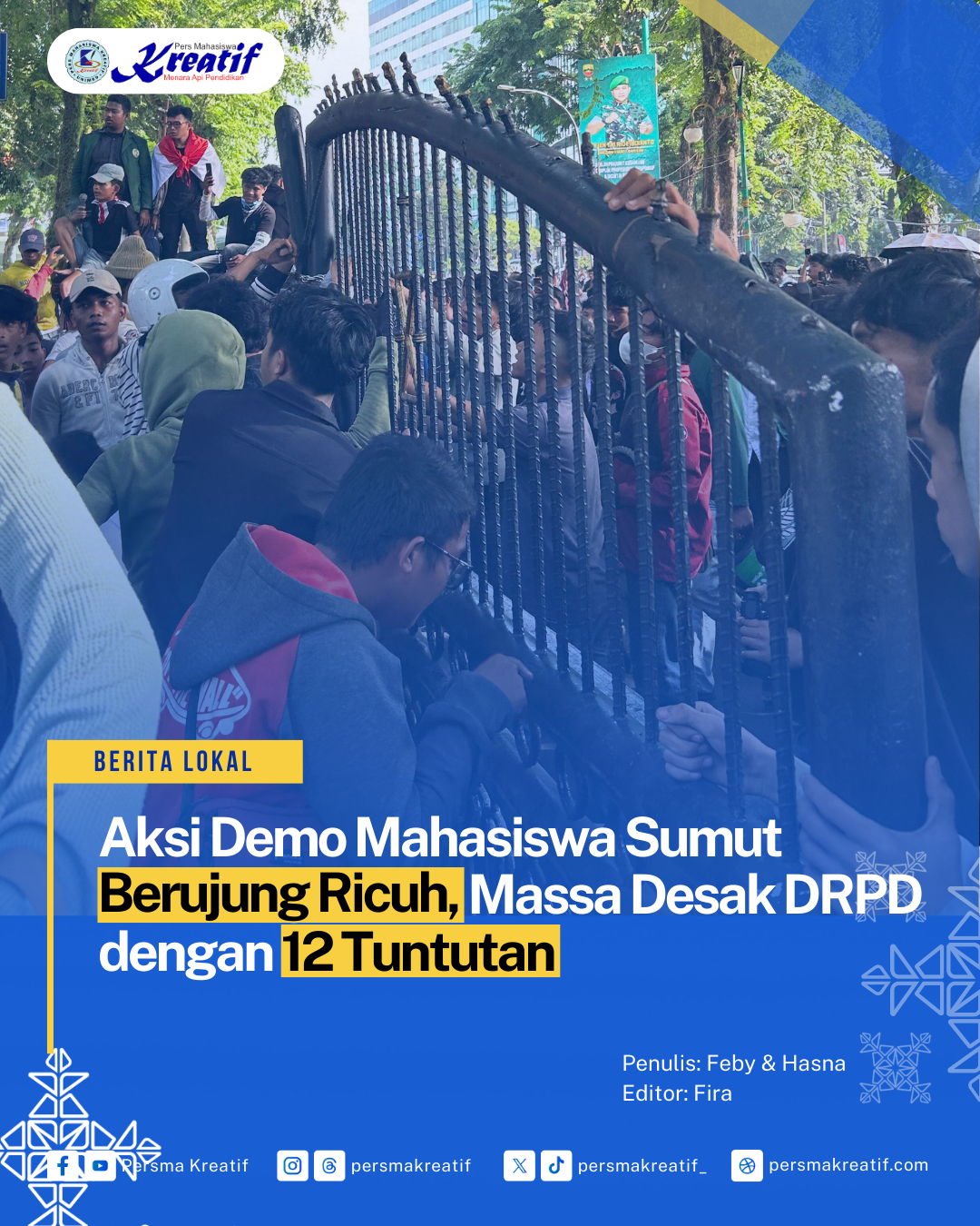 Medan, Persma Kreatif — Mahasiswa dan masyarakat menggelar aksi unjuk rasa di depan Gedung DPRD Sumatera Utara pada Selasa (26/08/2025).