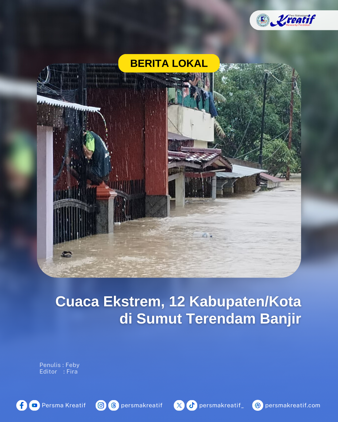 Medan, Persma Kreatif — Hujan berintensitas tinggi yang melanda Sumatra Utara sejak awal pekan menyebabkan banjir dan longsor di sedikitnya 12 kabupaten/kota. Daerah terdampak meliputi Mandailing Natal, Nias Selatan, Pakpak Bharat, Serdang Bedagai, Tapanuli Tengah, Tapanuli Utara, Nias, Tapanuli Selatan, Humbang Hasundutan, Padangsidimpuan, Sibolga, dan Langkat.