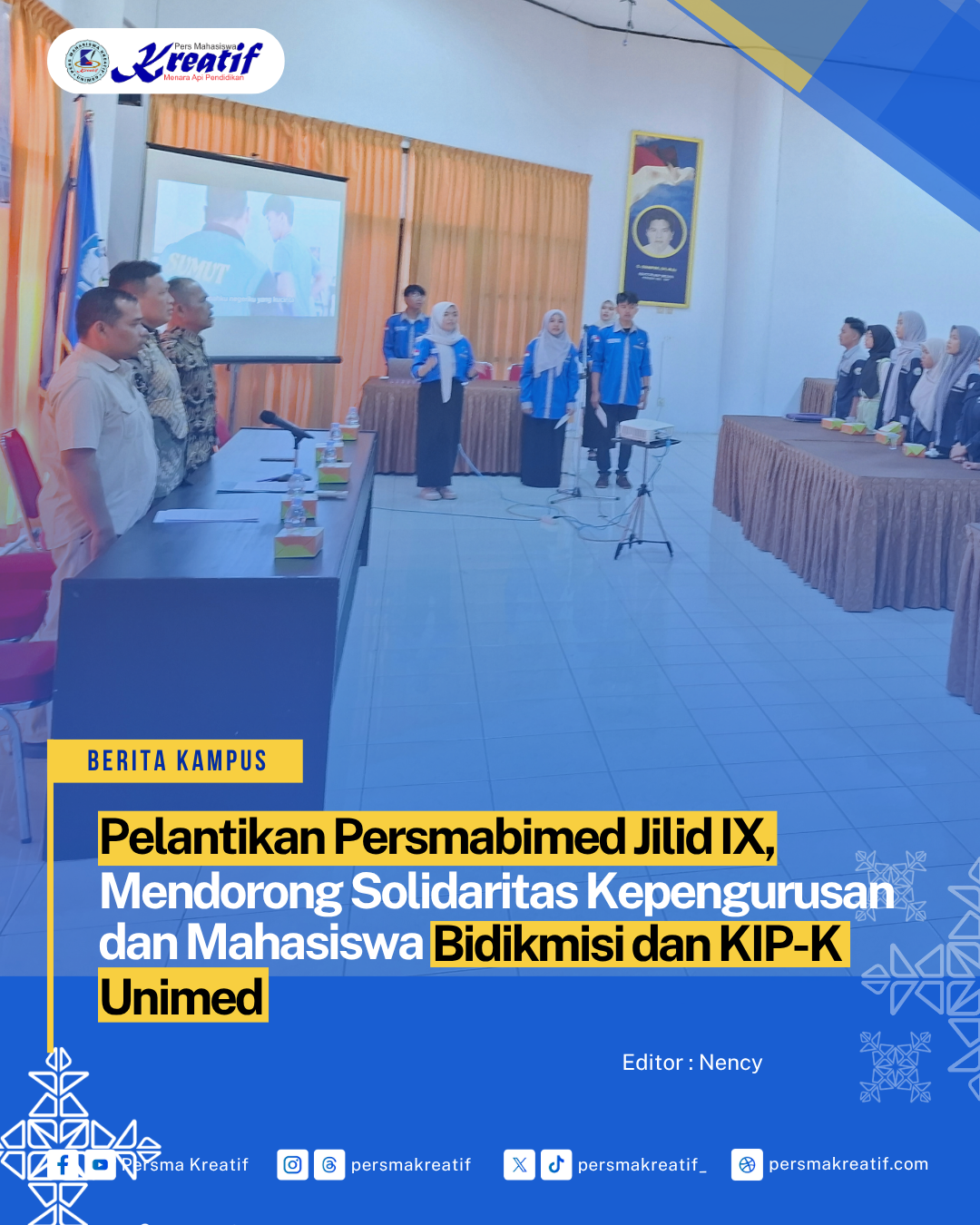 Medan, Persma Kreatif — Universitas Negeri Medan (Unimed) kembali melakukan pelantikan Pengurus Persmabimed (Persatuan Mahasiwa Bidikmisi/ KIP-K) untuk Jilid IX (sembilan) sebagai salah satu momentum yang penting, pada Rabu, (11/06/2025).