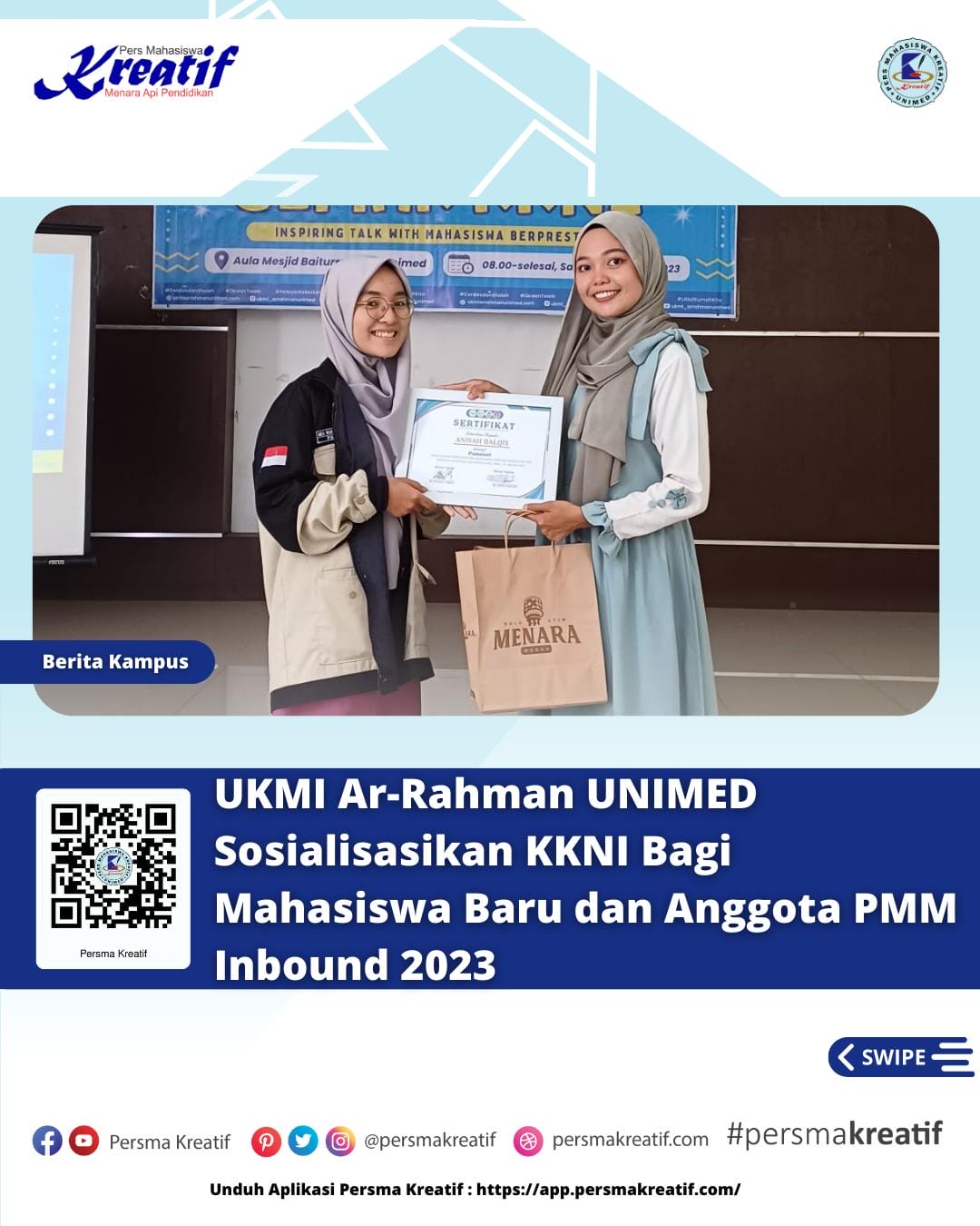 Unit Kegiatan Mahasiswa Islam (UKMI) Ar-Rahman Universitas Negeri Medan melaksanakan kegiatan SIMAK (Siap Menuntaskan) KKNI dan Inspiring Talk with Mahasiswa Berprestasi pada Sabtu, 26 Agustus 2023 di Aula Mesjid Baiturrahman Universitas Negeri Medan mulai dari pukul 09.00-12.00 WIB. Menghadirkan Ali Ahmatul Umri Hasibuan (Finalis KMI Award 2022) dan Anisah Balqis (Mawapres 1 FIS 2023) sebagai pembicara. Kegiatan SIMAK KKNI ini diikuti oleh para pengurus organisasi, panitia dan puluhan mahasiswa baru dan peserta PMM (Pertukaran Mahasiswa Merdeka) Inbound UNIMED dari berbagai Universitas di Indonesia.