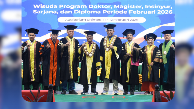 Medan, Persma Kreatif – Sebanyak 1.046 lulusan resmi dikukuhkan dalam Rapat Senat Terbuka Wisuda Periode Februari 2026 yang digelar Universitas Negeri Medan (Unimed) di Gedung Auditorium, Kamis (12/02/2026). Prosesi ini merupakan rangkaian hari kedua pelaksanaan wisuda yang berlangsung pada 11–12 Februari 2026.